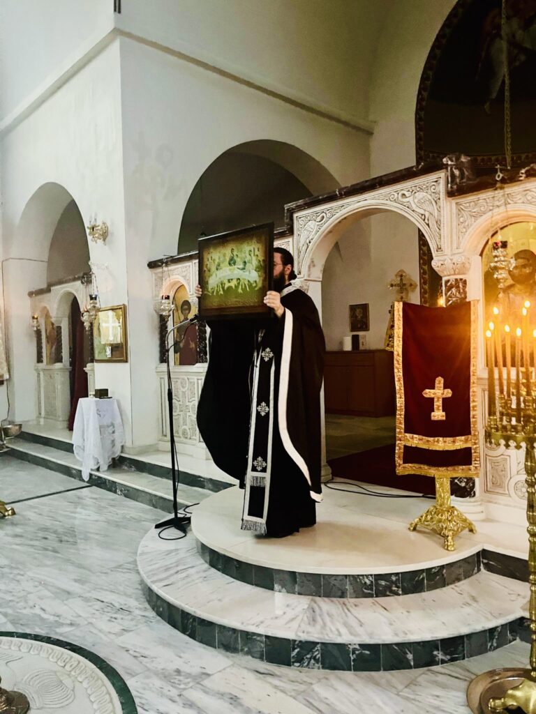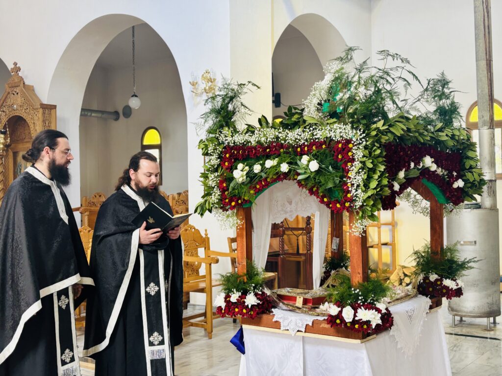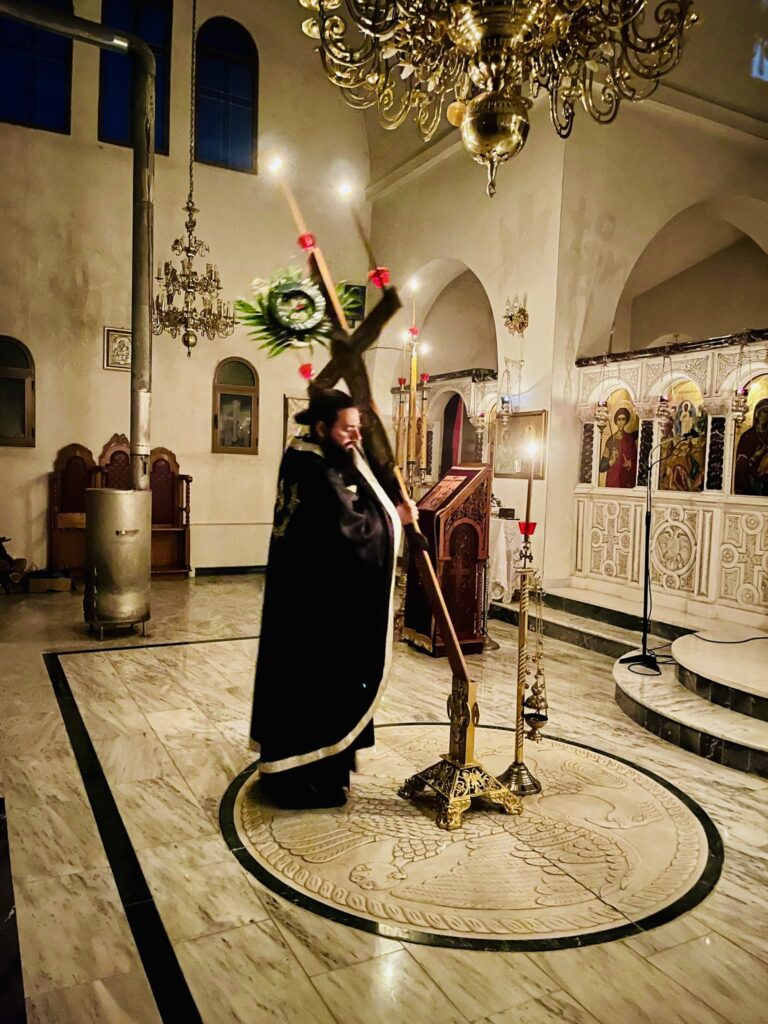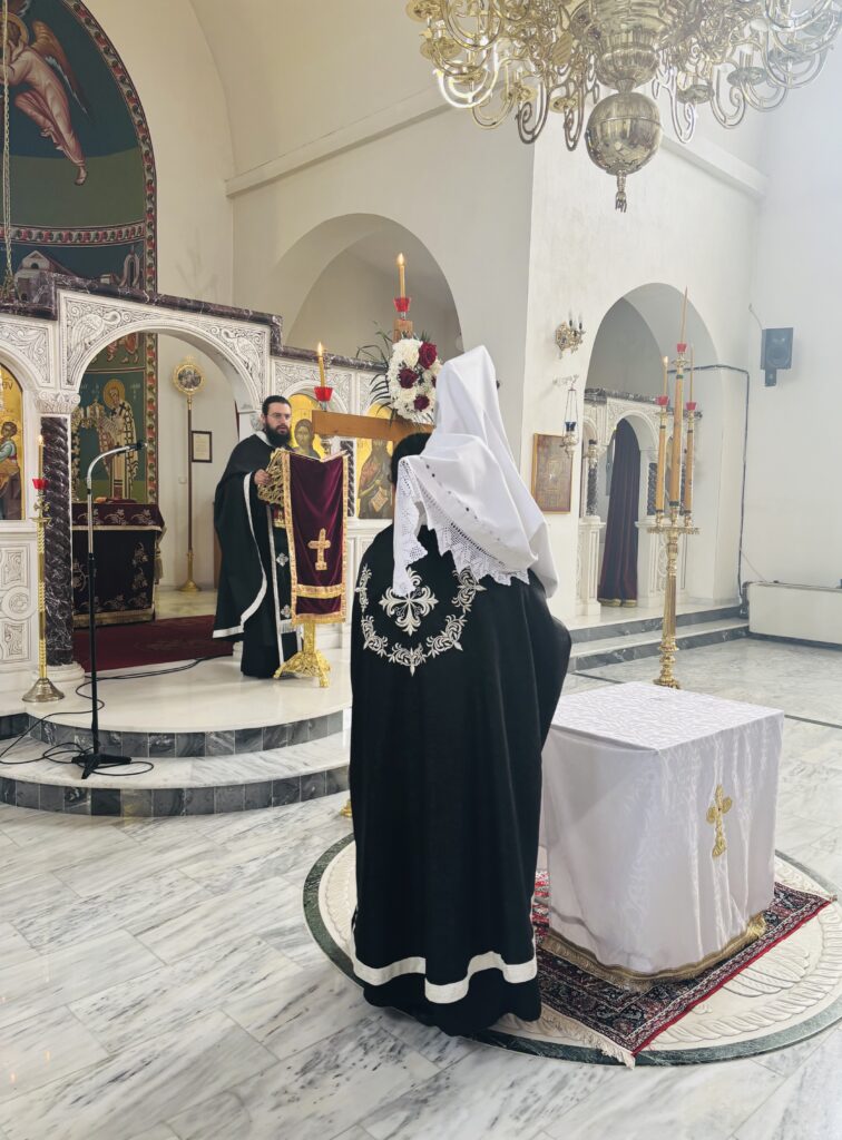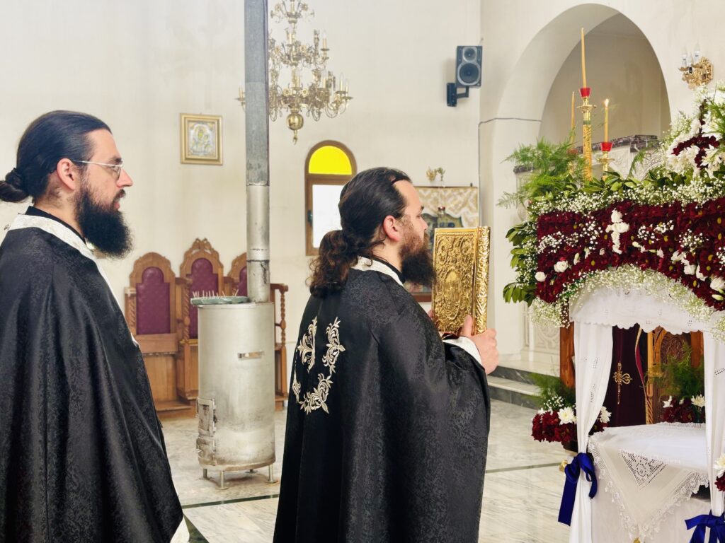 ῏Ην δὲ ἐκεῖ Μαρία ἡ Μαγδαληνὴ καὶ ἡ ἄλλη Μαρία, καθήμεναι ἀπέναντι τοῦ τάφου.