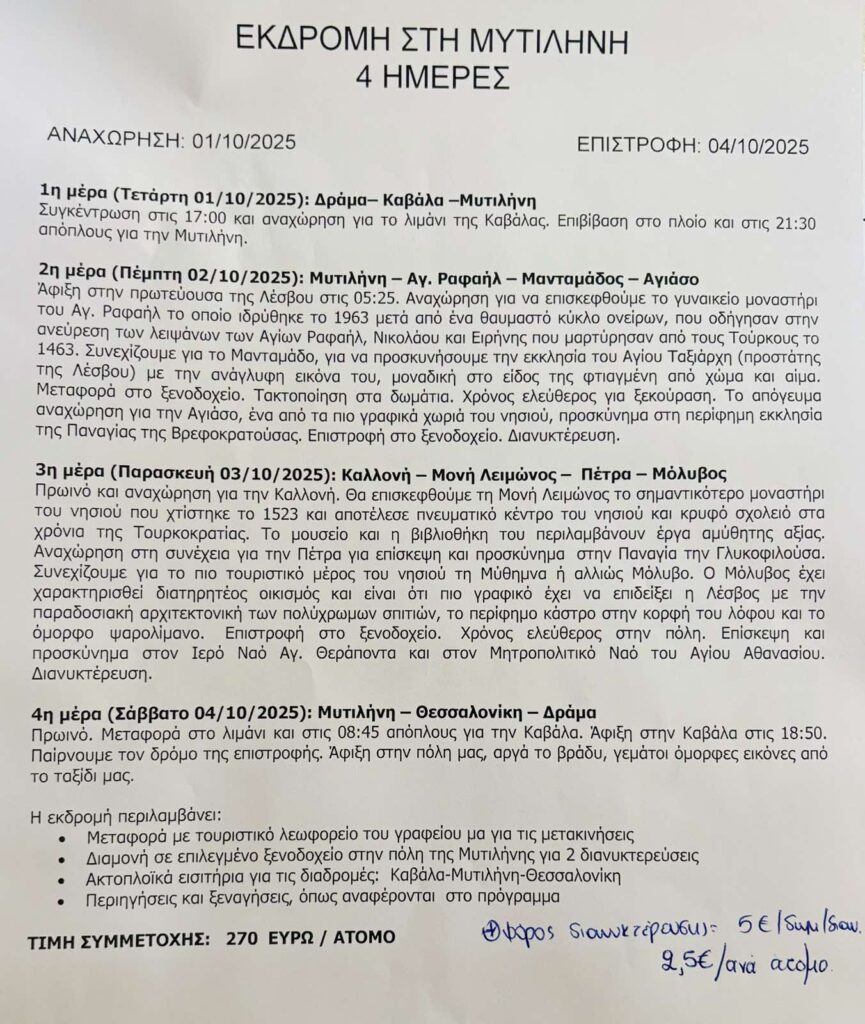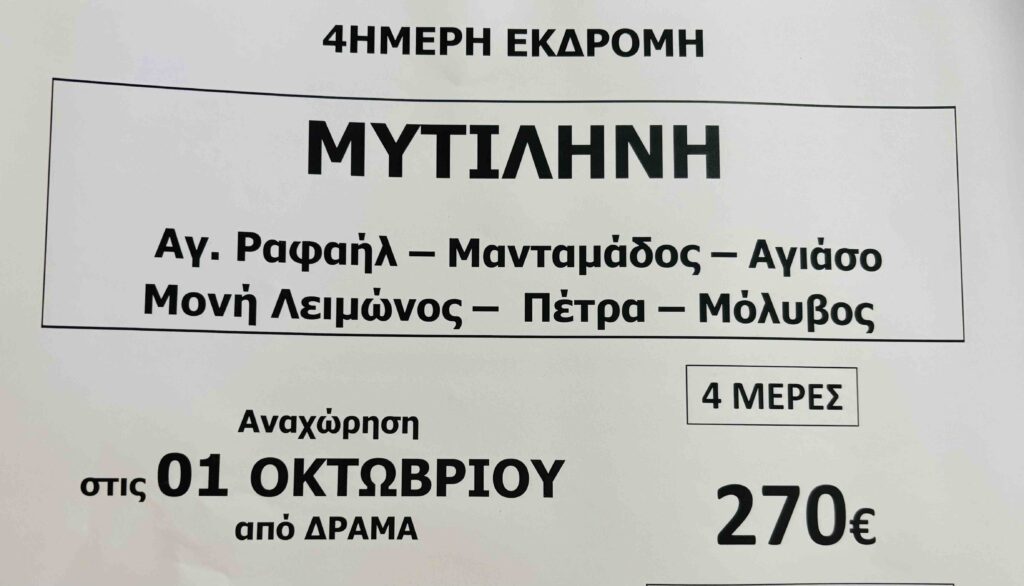 Η Ιερά Μονή Μεταμορφώσεως του Σωτήρος Πρασινάδας διοργανώνει τριήμερη προσκυνηματική εκδρομή στην Μυτιλήνη από 1 έως 4 Οκτωβρίου προς αγιασμό των πιστών, οι οποίοι θα έχουν την ευλογία να προσκυνήσουν την θαυματουργή εικόνα του Ταξιάρχη Μανταμάδου και τα Ιερά Λείψανα των Αγίων Ραφαήλ, Νικολάου και Ειρήνης.